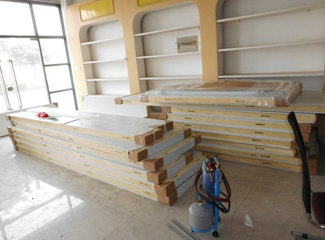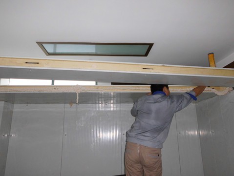 冷庫墻板拼裝完成,準(zhǔn)備裝頂板,在裝頂板的同時也是需要先打上發(fā)泡劑,以庫華冷庫的密封性,制冷效果好。